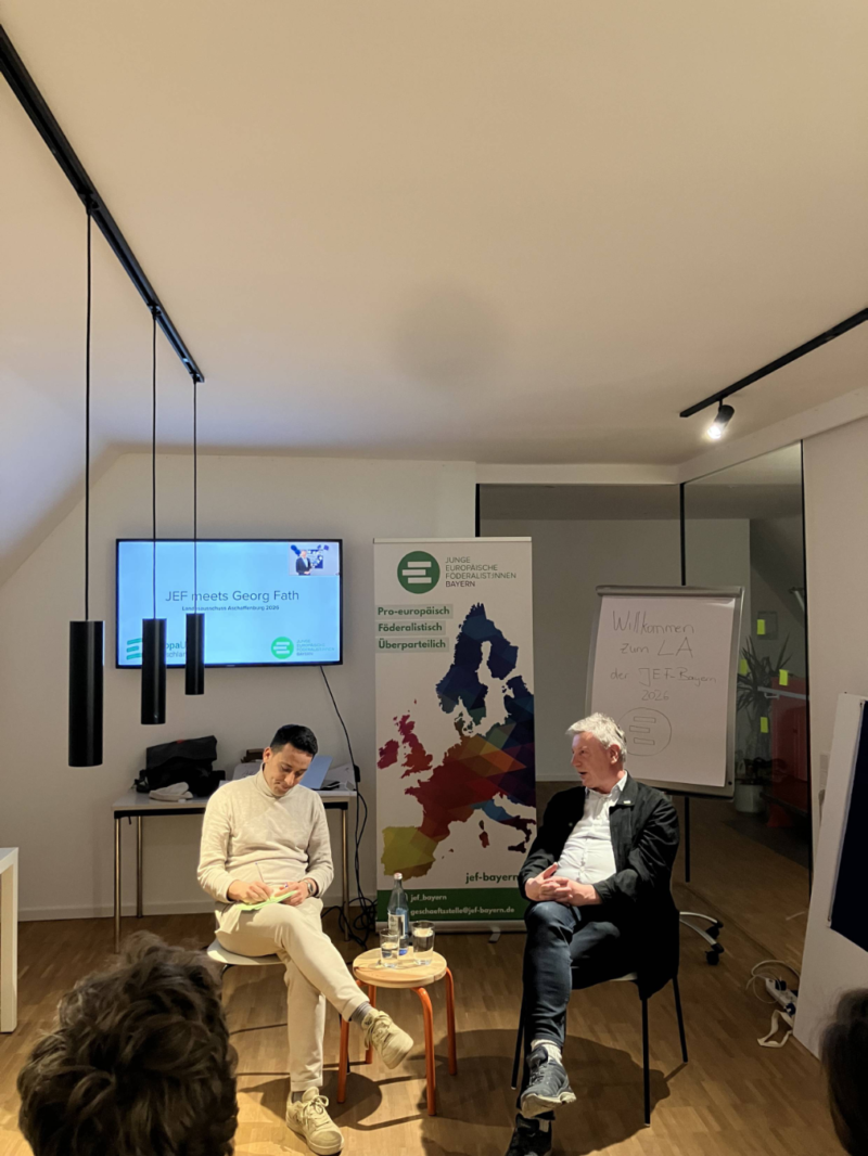 Unter dem Format „JEF meets“ kam es am Abend zum Austausch mit Georg Fath, dem Vorsitzenden des Kreisverbands Aschaffenburg der Europa Union. Zunächst im Dialog mit dem JEF-Bayern-Vorsitzenden Farras Fathi, danach im regen Austausch mit dem Plenum beantwortete Georg Fath Fragen zu seinem persönlichen Bezug zur Europa Union, zu Aktivitäten der Europa Union im Kreisverband und darüber hinaus, aber auch zu seiner Sicht der Wirkmöglichkeiten und Zukunftsperspektiven von Europa Union und JEF in der gegenwärtigen gesellschaftspolitischen Situation.