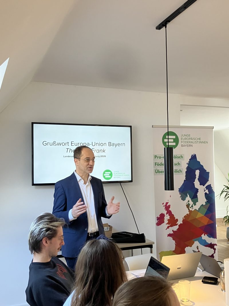 Thorsten Frank, der Vorsitzende der Europa-Union Bayern, war aus Augsburg angereist. In seinem Grußwort gab er Einblicke in die Arbeit der Europa-Union auf Landes- und Bundesebene und wies dabei auch auf die gute Zusammenarbeit zwischen JEF und EUB hin.